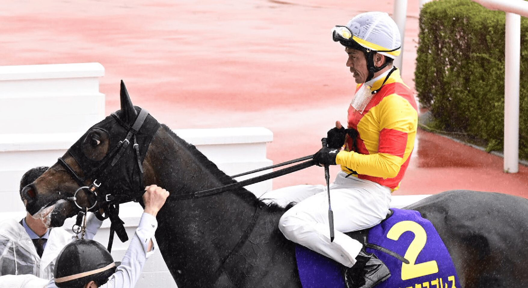 レース後もジョッキーの騎乗服に泥が付着が見られました。